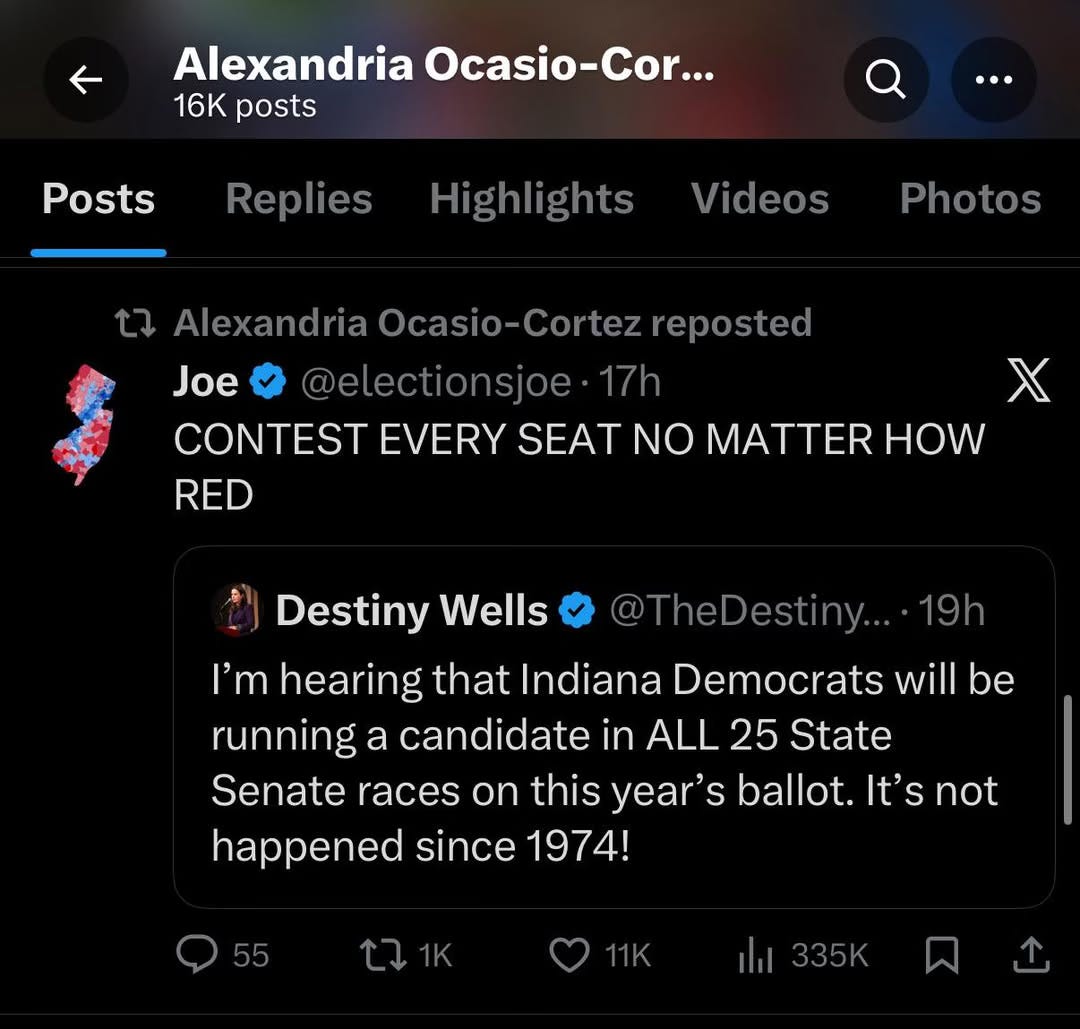 For the first time since 1974 — since Watergate — Democrats in Indiana have a candidate running in every State Senate race. Ninety-two of one hundred House seats are filled. I shared it on social media, and quickly it had almost a half million sets of eyes on it. Even AOC elevated Indiana’s story with a simple directive: run every seat.